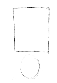 Stap 1Een paar eenvoudige vormen zijn de basis van de tekening. Pak een potlood en begin met het tekenen van een vierkant met daaronder een ovaal. Niet te dik. Straks worden een aantal van de lijnen die je tekent weer uitgegumd. |