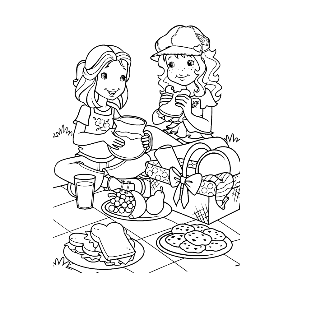 Print een vrolijke kleurplaat van het meisje Holly Hobbie en een van haar vriendinnen en vrienden.