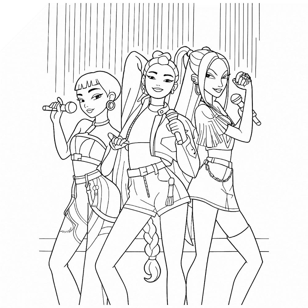 KPop Demon Hunters kleurplaat – Huntrix – Zoey, Rumi en Mira