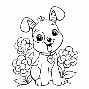 Vrolijke puppy tussen de bloemenTekst aan kleurplaat toevoegen Bekijk en print de grote versie