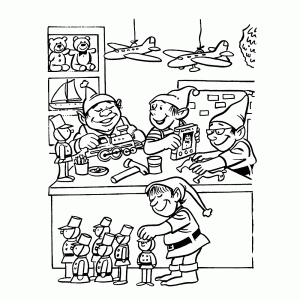 Hier vind je een aantal leuke kleurplaten van de werkplaats van de Kerstman op de Noordpool om te downloaden, printen en in te kleuren.