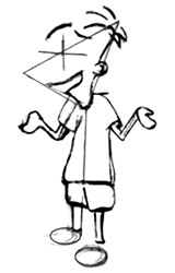 | Stap 2Maak de omtrek van het shirt en de broek van Phineas. Ook de armen en benen worden meer dan stokjes. Geef het hoofd van Phineas wat meer vorm. Zie je die plus in de driehoek van het hoofd? Dat zijn hulpmiddelen om straks de ogen van Phineas te kunnen tekenen. | ![]() |