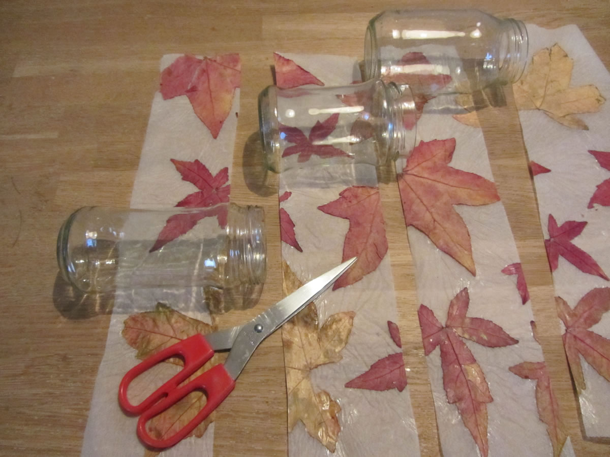 - Smeer de zijde waarop de bladeren zitten in met hobbylijm en plak de strook op het glazen potje.